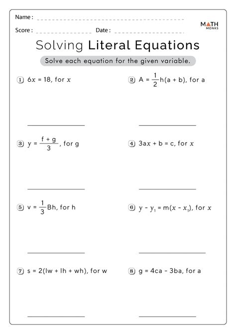 Free trial available at kutasoftware.com. Use the same process you use to isolate the variable in an algebraic equation with one variable. D rt now in algebra i you learned how to solve equations like 3x 5 8, which have one single variable (in this case, x). Begin your practice with our free worksheets! ( ) ( ) √ √ √ solve for f: They would solve this on their dry erase boards. Web 580 + results sort by: This four page worksheet includes 24 questions on literal equations with a school theme that can be used for the end of the school year or the back to school. Web literal equations worksheet solve for the indicated variable in the parenthesis. Web free collection of solving literal equations worksheets for students. Web literal equation is an equation containing more than one variable.