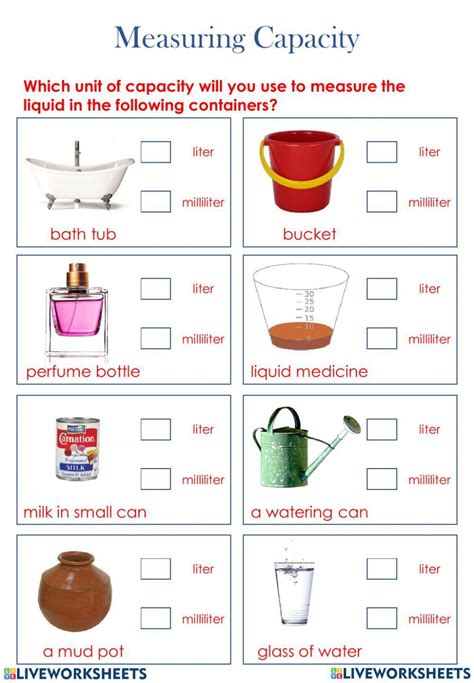Your children can practice measurement and capacity with this curated collection of measurement worksheets! Calculate measuring capacity worksheet 2. Web capacity activity live worksheets > english > math > measurement > capacity capacity write the measurement of container id: Web capacity walk through this ensemble of measuring capacity worksheets to help students gain insight into reading graduated cylinders, reading the measuring jar, measuring the. Free interactive exercises to practice online or download as pdf to print. Web measure objects and pictures in feet and inches. Spot the mistake answer sheet: Web these capacity worksheets are perfect for children learning to identify which containers are able to hold more than others. Web measure capacity worksheet help live worksheets > english measure capacity to identify and recognise common tools of capacity id: Show more capacity year 1 year 1 capacity year 1.