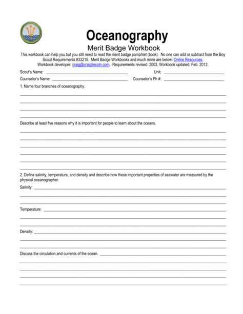 Oceanography Merit Badge Worksheet. Discuss the circulation and currents of the ocean. Each scout must do each requirement.