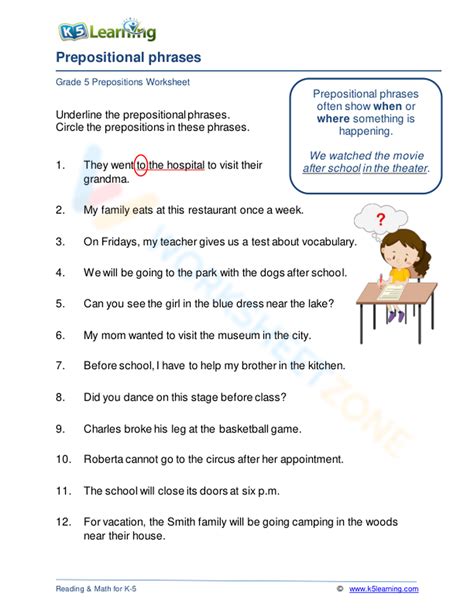 My family and i enjoy walking through the woods with our dogs. Web grade 4 parts of speech prepositional phrases prepositional phrases prepositions + objects = prepositional phrases prepositional phrases ( at home, across the street) always begin with a preposition and include the object of the preposition, usually a noun or pronoun. Our teachers are hosting a meeting in the library after school. Its aim is to practice various prepositional phrases in differen. When prepositional phrases are used as adjectives, the phrase comes immediately after the noun or pronoun it modifies. Prepositional phrases (u2) by odruz. These relationships can show time, place, or direction. Mixed review language arts assessment: View worksheet answers sink it In this exercise, students recognize prepositional phrases. Web prepositional phrases and vocabulary.