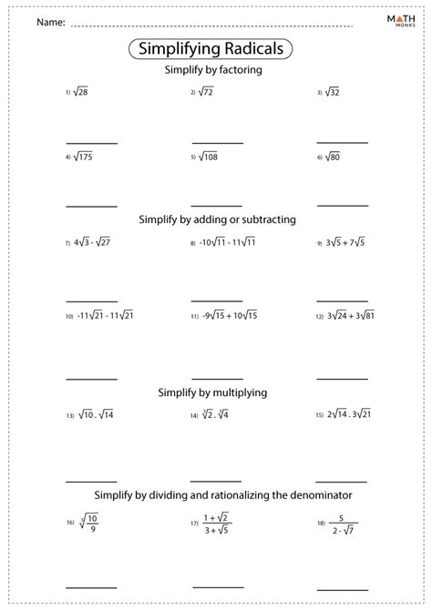 A radical is in simplified form if the following three conditions are satisfied. Web simplifying radical expressions worksheets. 4) 5) 6) 7) 19 6!!±!!12 6 8) 9 7!!±!!17 7! Web simplifying radicals worksheet 1 in 2020. Find the prime factors of the numbers or expressions inside the radical. Web a worked example of simplifying an expression that is a sum of several radicals. Web l1s1 1) 8 3!!+!!6 3! Created by sal khan and monterey. There are a total of 20. The answers can be found below. Web to simplify a radical expression, look for factors of the radicand with powers that match the index.