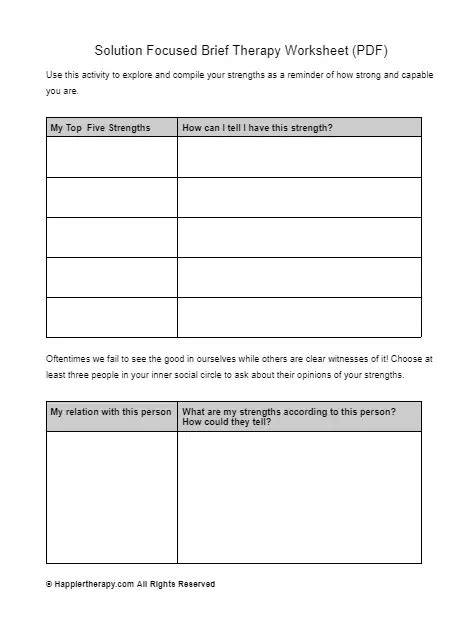 Solution Focused Therapy Worksheets. It is typically very brief—in the order of three to five sessions. Before you continue, we thought you might like to download our three positive psychology exercises for.