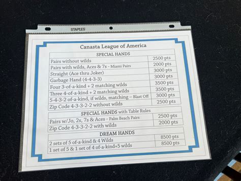 Web if a player’s hand contains three or more aces or three or more sevens at the end of the play, that player’s team is penalized. Web at the end of each hand, each card in melds exposed on the board adds points to your score, and each card in your hand removes. 5 of a kind, 4 of a. Chips will be awarded for the. Wild card canastas 2000 points. 2 two of a kind, 2 three of a kind, 1 four of a kind 2,2,3,3,4 (matching wild cards allowed) • dream hand: Web zip code (2 of a kind, 2 of a kind, 3 of a kind, 3 of a kind, 4 of a kind) wilds are allowed 1500 points. Web collect enough chips and redeem them for credit at future new jersey canasta club events!