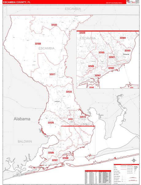 Escambia County, FL Zip Code Wall Map Red Line Style by MarketMAPS