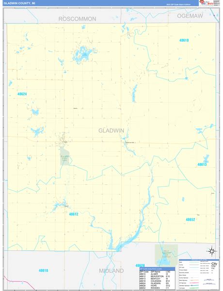 Gladwin County, MI Zip Code Wall Map Red Line Style by MarketMAPS