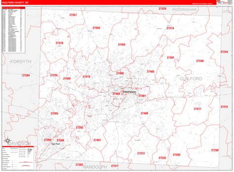 Guilford County, NC Zip Code Wall Map Red Line Style by MarketMAPS