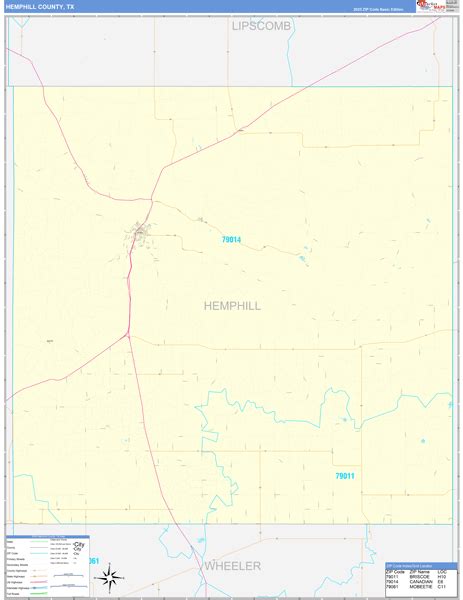 Hemphill County, TX Zip Code Wall Map Red Line Style by MarketMAPS