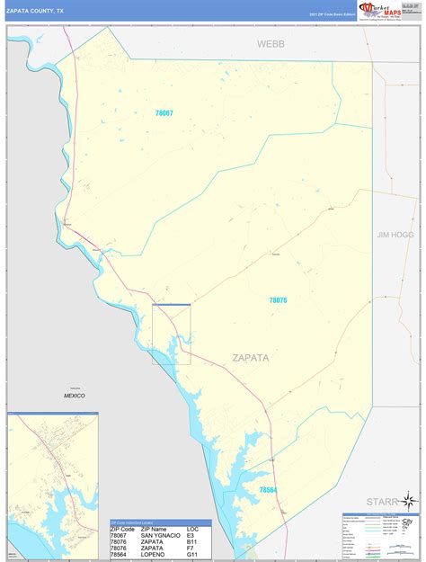 Zapata County, TX Zip Code Wall Map Red Line Style by MarketMAPS