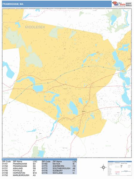Framingham Massachusetts Zip Code Wall Map (Red Line Style) by