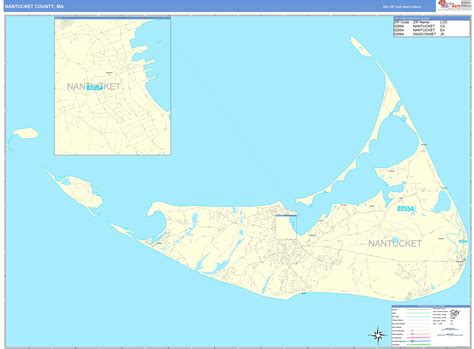Nantucket County, MA Zip Code Wall Map Red Line Style by MarketMAPS